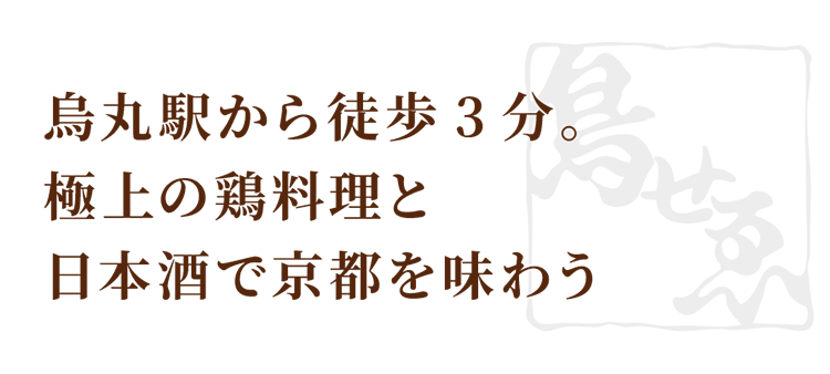 阪急京都線「烏丸駅」から徒歩3分。「鳥せゑ 蛸薬師店」では、こだわり尽くした「鶏肉」×「日本酒」でおもてなしいたします。
